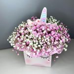 “Сиреневый туман” – композиция из гипсофилы в шляпной коробке