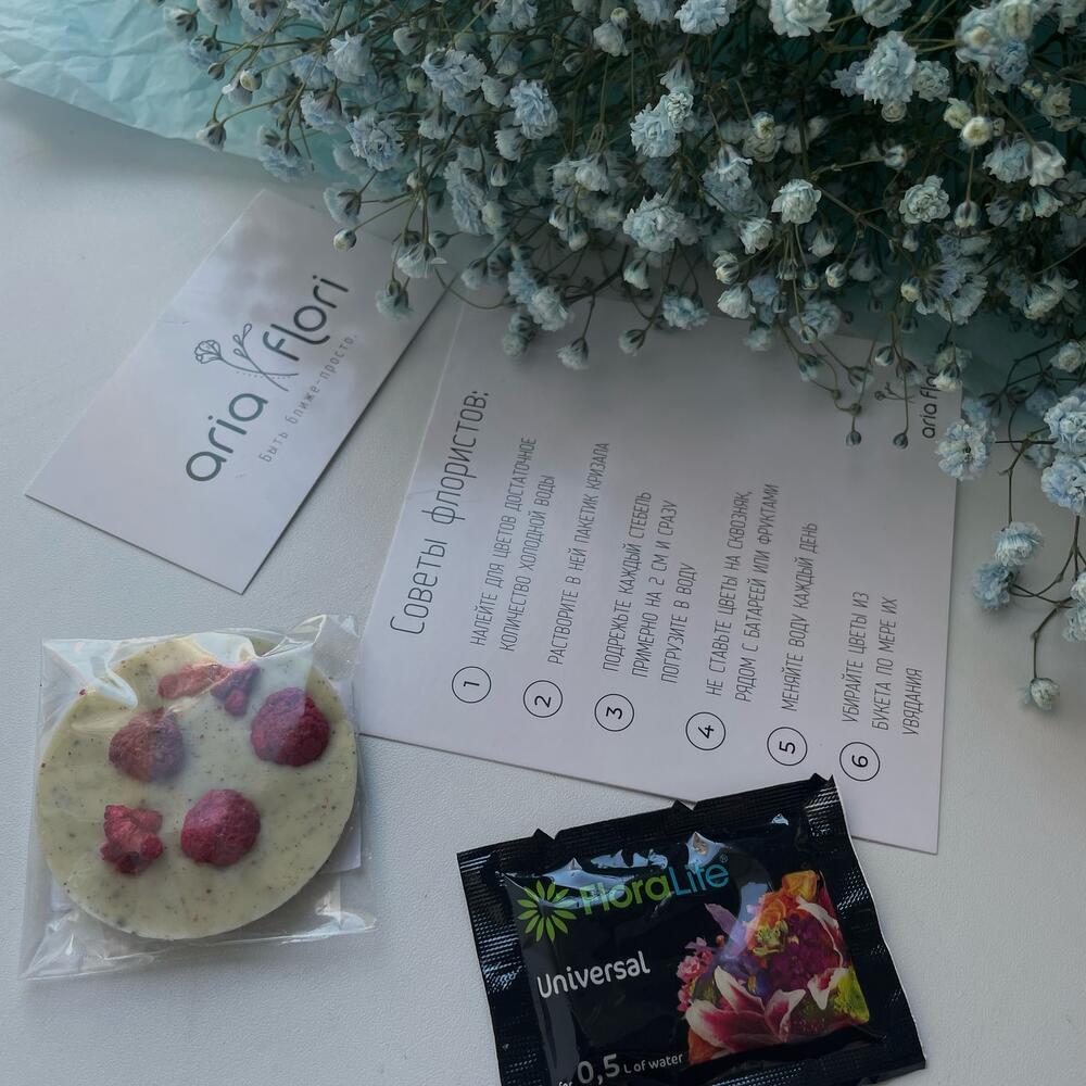 Гипсофила – 5 шт.Упаковка дизайнерская – 1 шт.подкормка для срезанных цветов – 1 шт.любовь флориста – 100 шт.записка с вашим текстом – 1 шт.медиант ручной работы – 1 шт.советы по уходу за срезанными цветами – 1 шт.