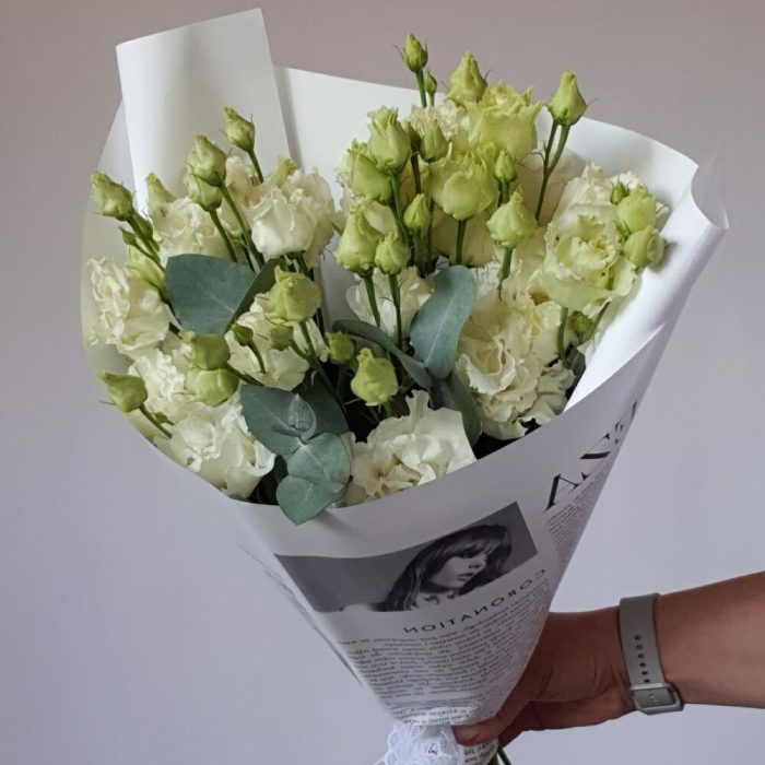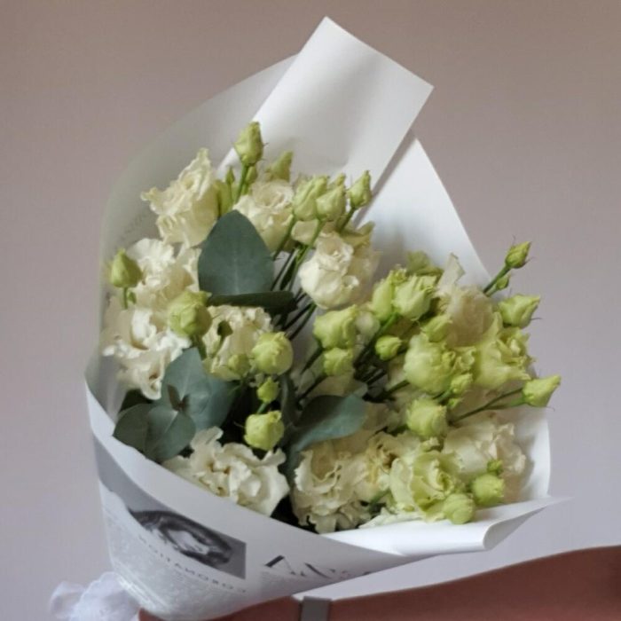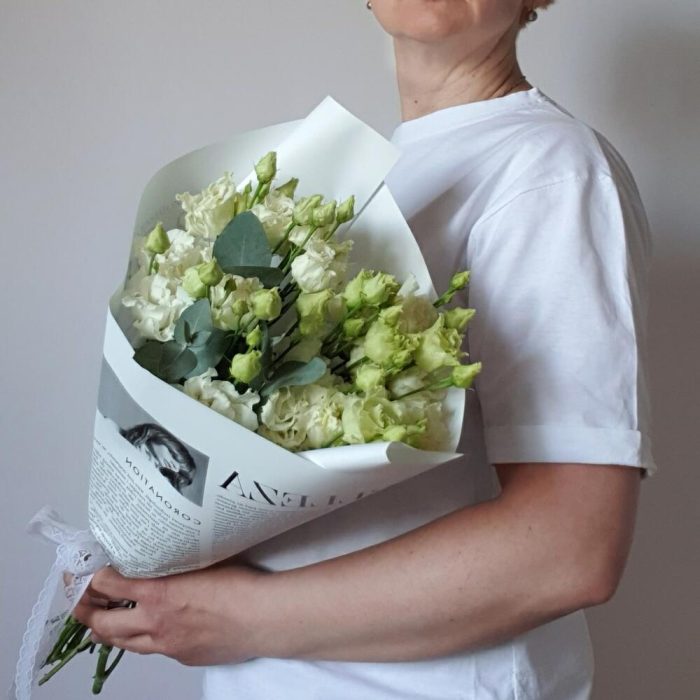 Лента – 1 шт.Эвкалипт – 3 шт.Упаковка – 2 шт.Лизиантус белый – 5 шт.