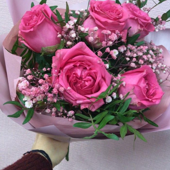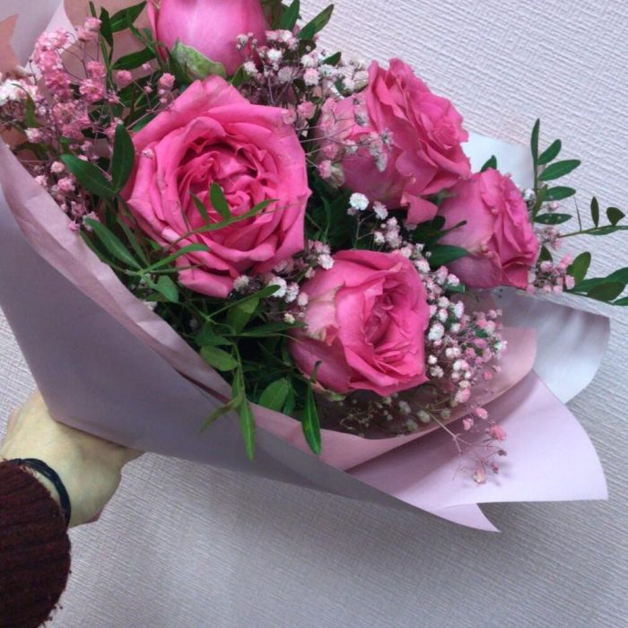 Лента – 1 шт.Роза – 5 шт.Упаковка – 1 шт.Гипсофила розовая – 1 шт.зелень декоративная – 2 шт.