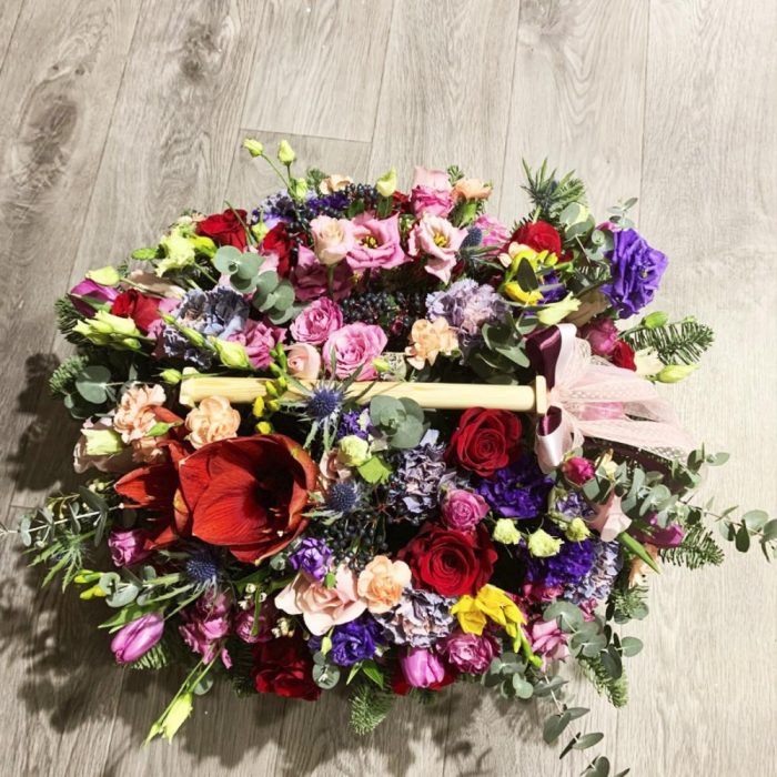 Яркая и объемная композиция с классическими розами цвета бордо, пионовидными кустовыми розами семейства “Бомбастик”, махровой нежно-розовой и фиолетовой эустомой, ягодами вибурнума, нежнейшими тюльпанами, диантусами, крупным амариллисом, пряной зеленью эвкалипта, составленная на оазисе в деревянном ящике ручной работы.Композиция буквально наполнена прекрасной энергетикой, в ней любовь красных роз и восхищение розовых кустовых роз, нежность диантусов и чистосердечная радость эустомы, пожелания успеха и процветания желтых фрезий.Эта невероятно чувственная композиция – прекрасный и действительно особенный подарок, который по достоинству оценят.