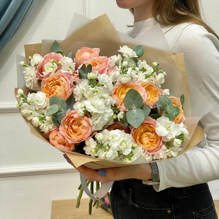 Кустовая пионовидная роза – 5 шт.маттиола белая ароматная – 9 шт.Упаковка – 2 шт.эвкалипт 50 – 6 шт.