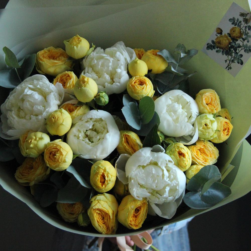 Пион белый – 5 шт.Пионовидная кустовая роза – 5 шт.Эвкалипт – 7 шт.Упаковка – 2 шт.Лента атласная – 2 шт.Открытка – 1 шт.