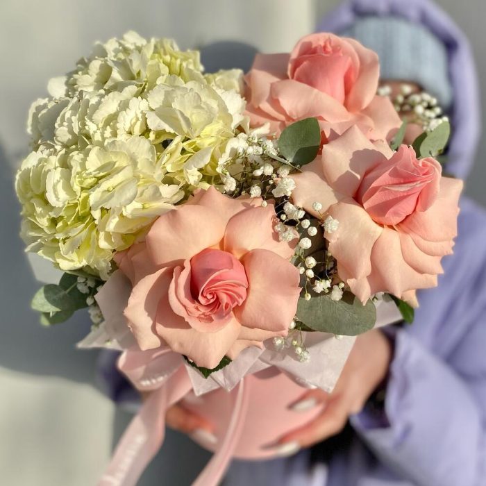 Гипсофила – 2 шт.Гортензия – 1 шт.Тишью – 1 шт.Коробка шляпная – 1 шт.Оазис флористический – 1 шт.Роза pink mondial – 3 шт.