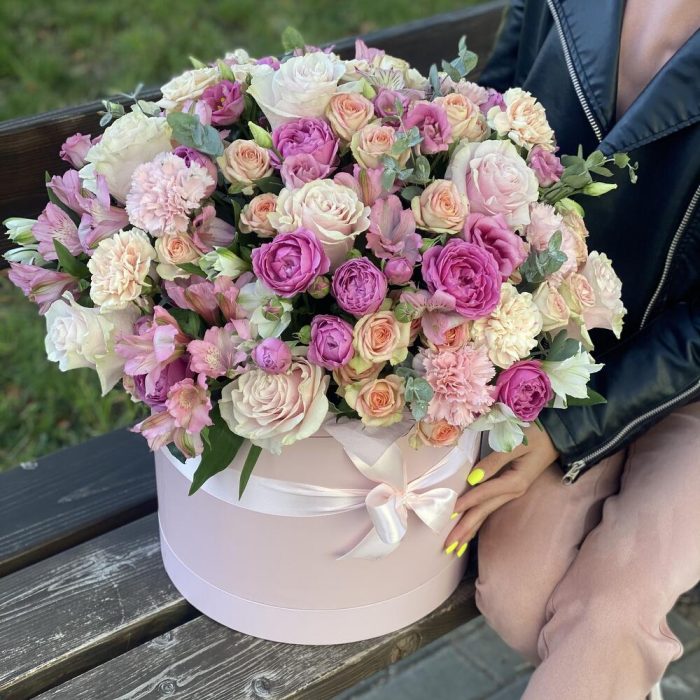 Коробка – 1 шт. Оазис – 4 шт. Эустома – 6 шт. Роза розовая – 10 шт. Эвкалипт – 4 шт. Кустовая роза – 18 шт. Гвоздика сортовая – 10 шт. Альстромерия – 13 шт. Оформление – 1 шт.